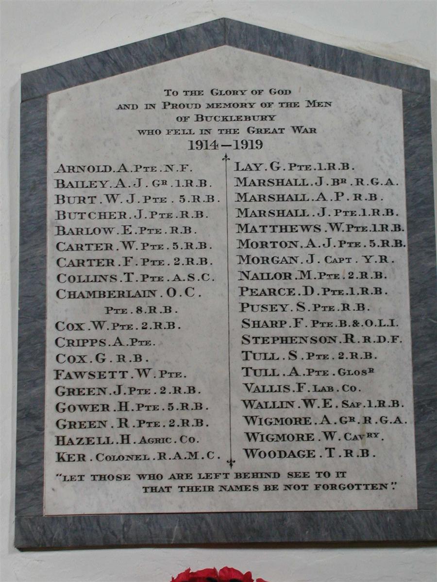 To the Glory of God / and in Proud memory of the Men / Bucklebury / who fell in the Great War / 1914-1919