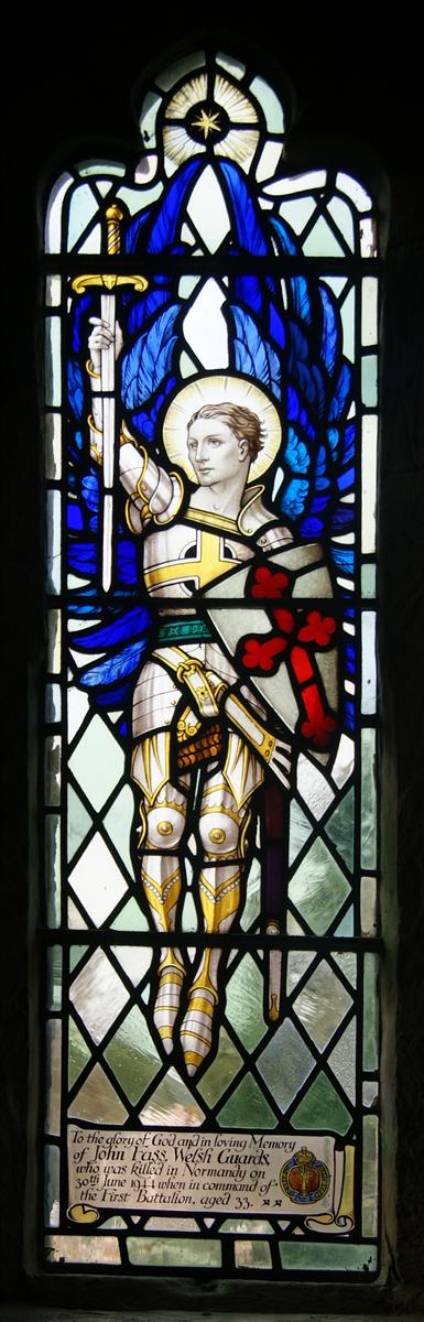 To the glory of God and in loving memory/ of John Fass, Welsh Guards,/ who was killed in Normandy on/ 30th June 1944 when in command of/ the First Battalion, aged 33.