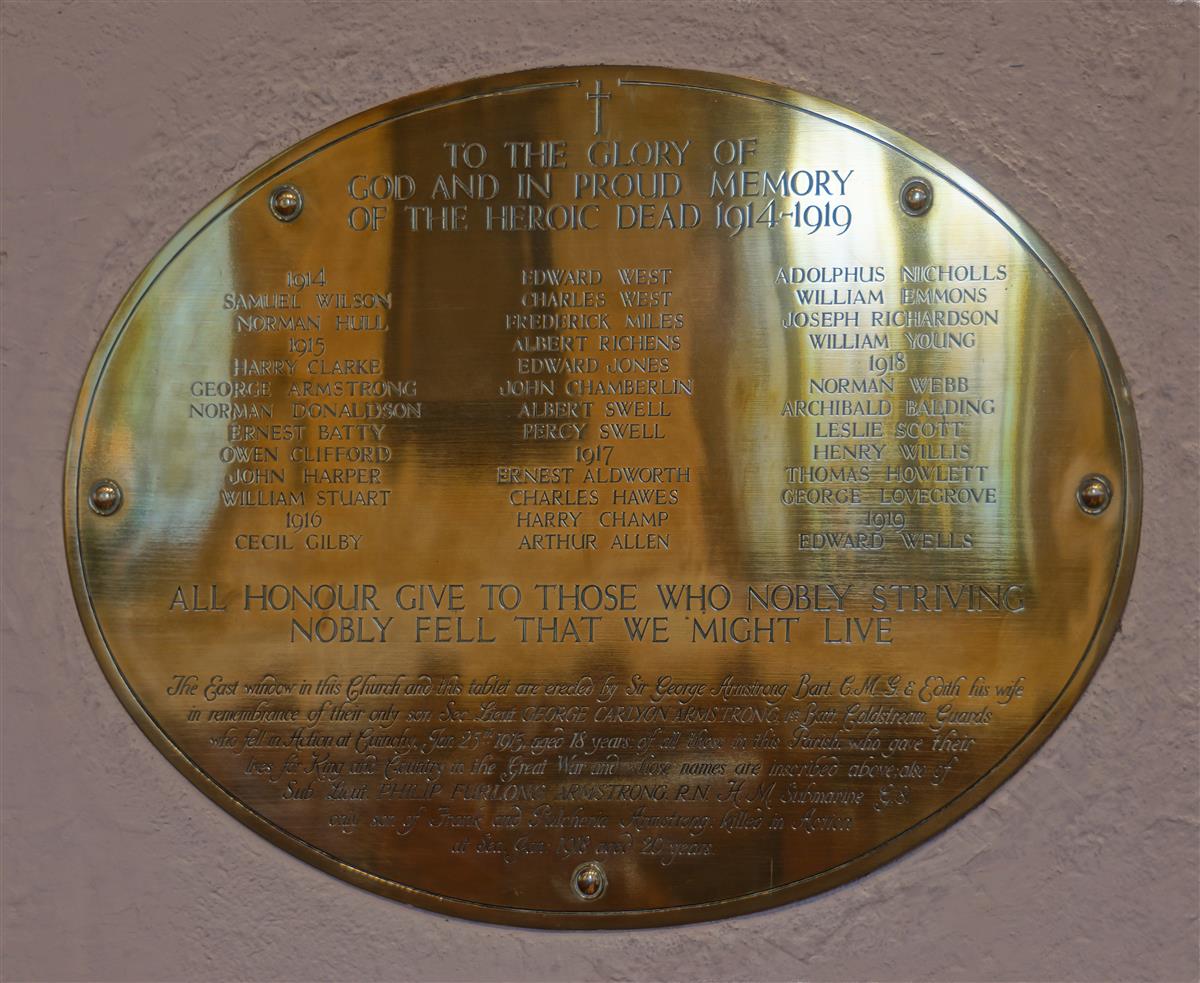 The East window in the Church and this tablet are erected by Sir George Armstrong Bart CMG & Edith his wife