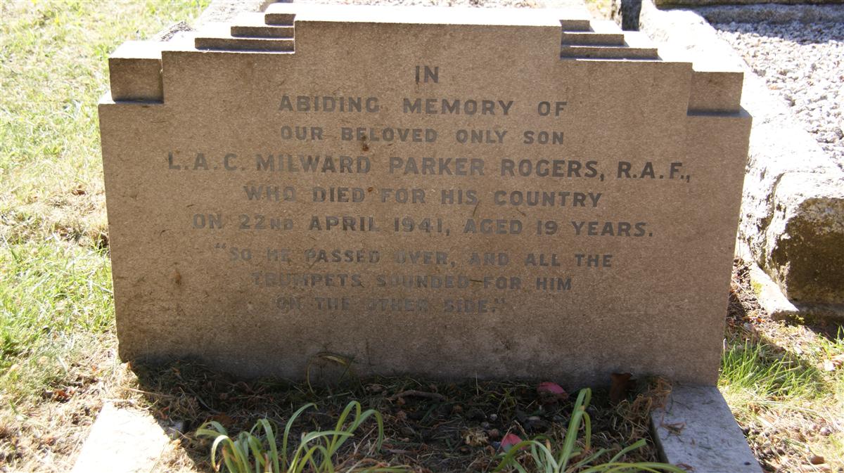In / abiding memory of / our beloved only son / LAC Milward Parker Rogers, RAF / who died for his country / on 22nd April 1941, aged 19 years / "So he passed over, and all the / trumpets sounded for him / on the other side."