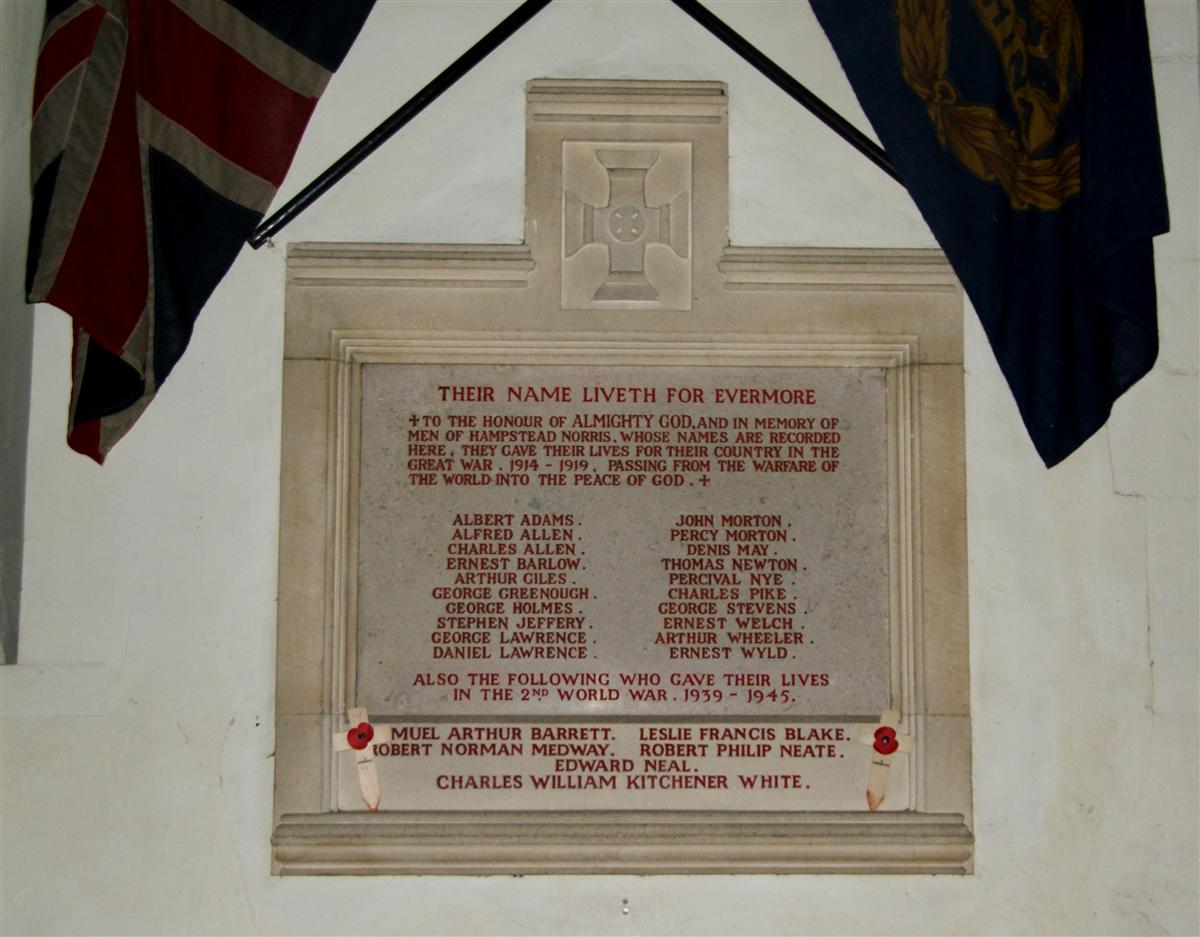 To the honour of almighty God, and in memory of / the men of Hampstead Norris whose names are recorded / here. They gave their lives for their country in the / Great War 1914 – 1919, passing from the warfare of / the world into the peace of God.