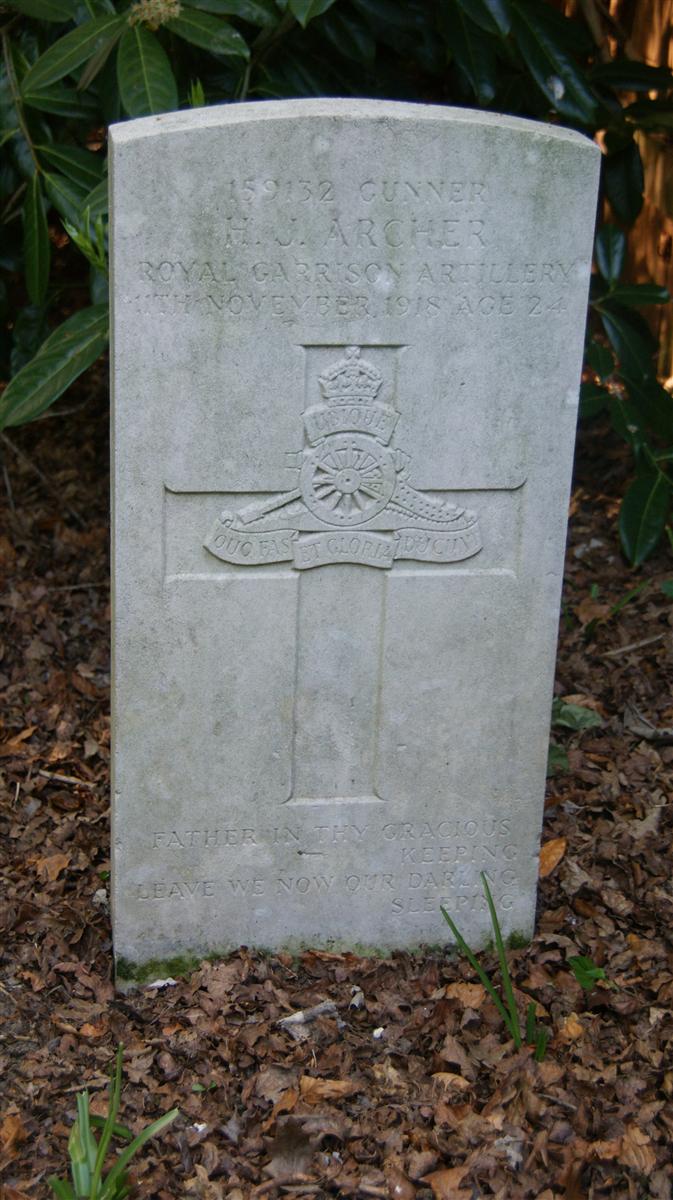 159132 Gunner / H J Archer / Royal Garrison Artillery / 11th November 1918 Age 24 / Father in thy gracious keeping / leave we now our darling sleeping