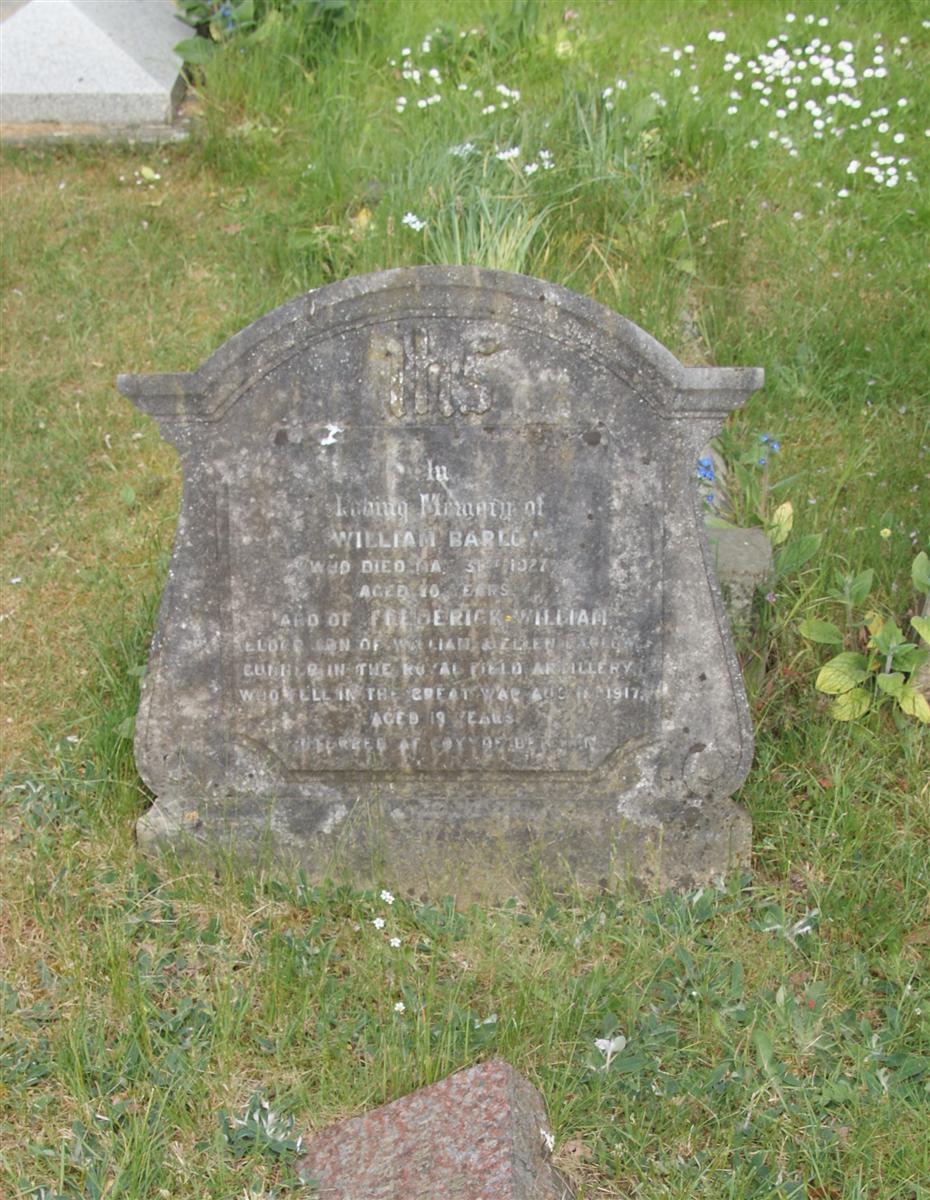 In / Loving Memory of / William Barlow / who died May 31st 1927 / aged 70 years / and of Frederick William / elder son of William & Ellen Barlow / Gunner in the Royal Field Artillery / who fell in the Great War Aug 18th 1917 / aged 19 years / Interred at Coxyde, Belgium