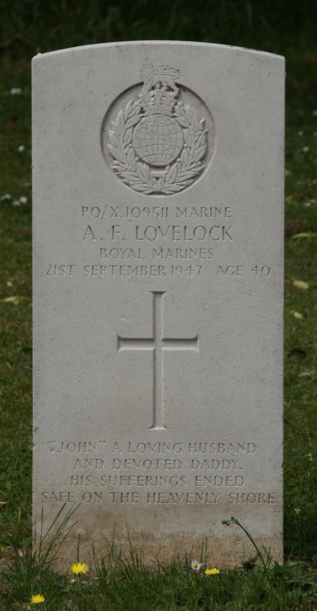 PO/X 109511 Marine / A F Lovelock / Royal Marines / 21st September 1947 Age 40 / “John” a loving husband / and devoted daddy / his suffering ended / safe on the heavenly shore