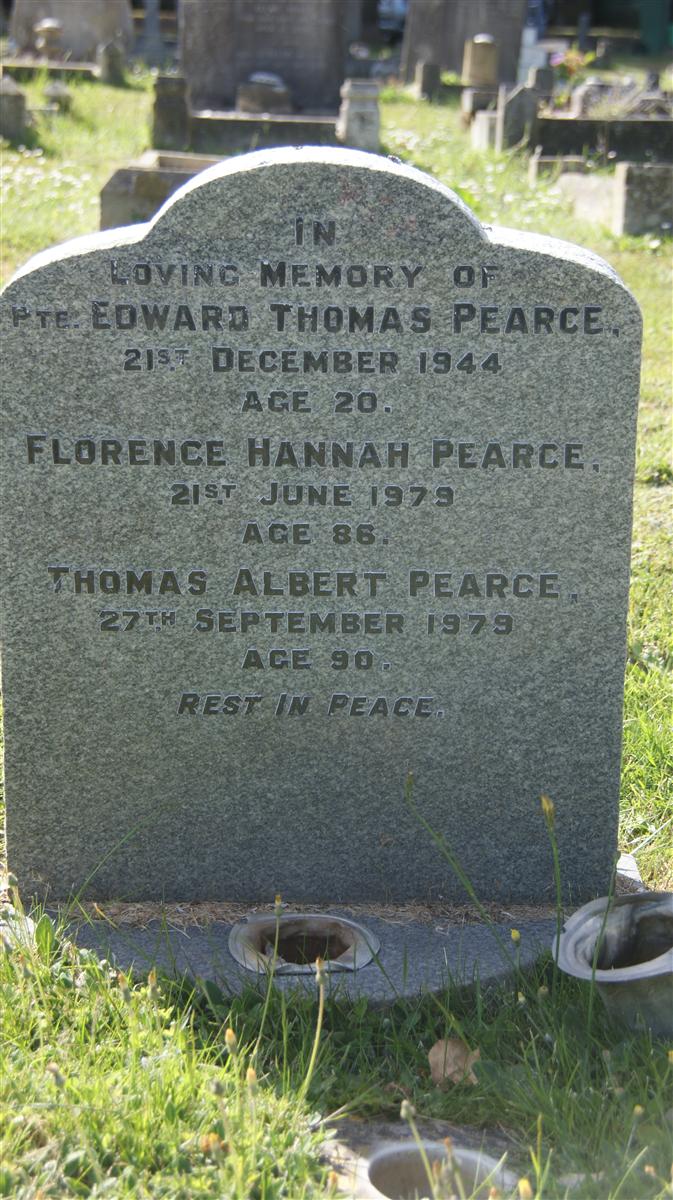 In / loving memory of / Pte Edward Thomas Pearce / 21st December 1944 / Age 20 / Florence Hannah Pearce / 21st June 1979 / Age 88 / Thomas Albert Pearce / 27th September 1979 / Age 90. / Rest in Peace