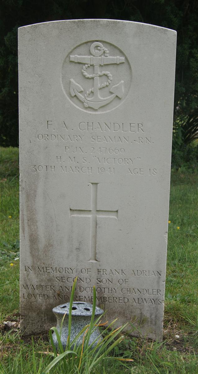 F A Chandler / Ordinary Seaman RN / P/JX 247669 / HMS Victory / 30 March 1941 Age 18 / In memory of Frank Adrian / second son of / Walter and Dorothy Chandler / loved and remembered always