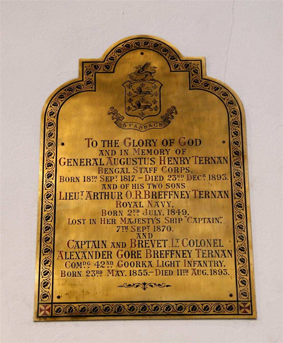To the Glory of God / and in memory of / General Augustus Henry Ternan / Bengal Staff Corps. / Born 18th Sept 1817 – Died 23rd Decr 1893 / and of his two sons . Lieut Arthur O R Breffney Ternan / Royal Navy. / Born 2nd July 1849. / Lost in Her Majesty’s Ship “Captain”. / and / Captain and Brevet Lt Colonel / Alexander Gore Breffney Trenan / Comdg 42nd Goorka Light Infantry. / Born 23rd May 1855 – Died 11th Aug 1893.