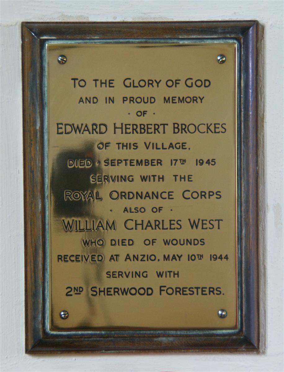 To the Glory of God / and in proud memory / of / Edward Herbert Brockes / of this village, / died – September 17th 1945 / serving with the / Royal Ordnance Corps / also of / William Charles West / who died of wounds / received at Anzio, May 10th 1944 / serving with / 2nd Sherwood Foresters.