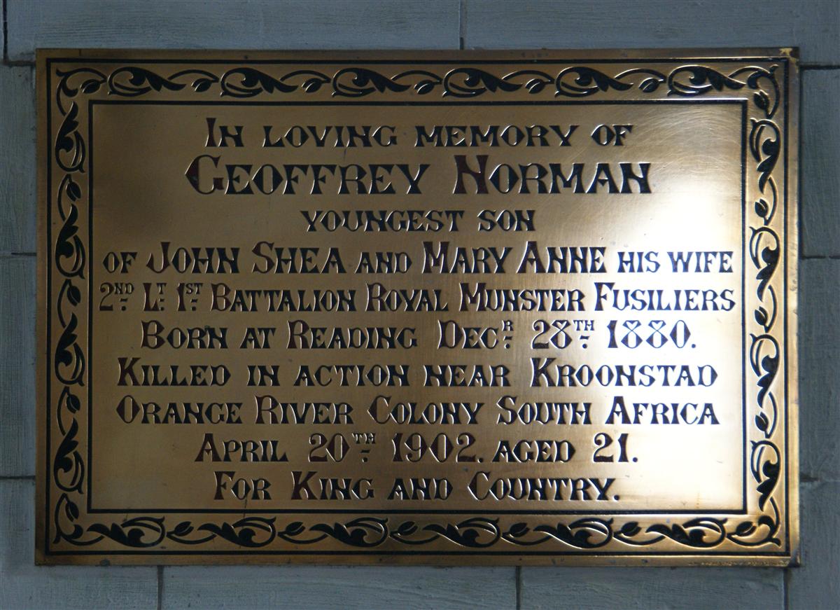 In loving memory of / Geoffrey Norman / youngest son / of John Shea and Mary Anne his wife / 2nd Lt 1st Battalion Royal Munster Fusiliers / Born at Reading Decr 28th 1880. / Killed in action near Kroonstad / Orange River Colony South Africa / April 20th 1902 aged 21 / For King and Country