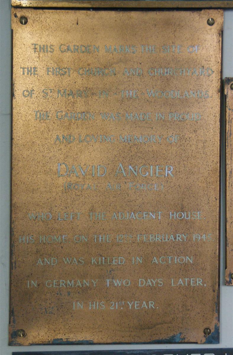 This garden marks the site of / the first church and churchyard / of St. Mary in the Woodlands. / The garden was made in proud / and loving memory of / David Angier / Royal Air Force, / who left the adjacent house, / his home, on 12th February 1945 / and was killed in action / in Germany two days later, / in his 21st year.