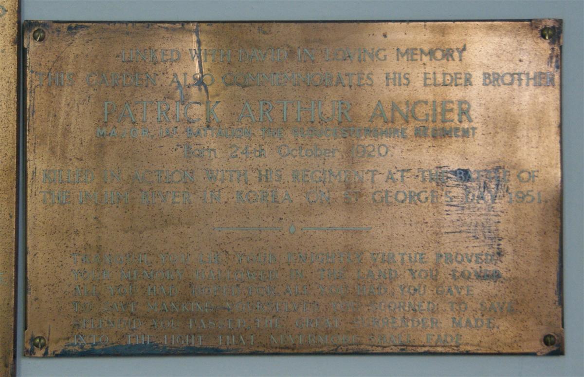 Linked with David in loving memory / this garden also commemorates his elder brother / Patrick Arthur Angier / Major, 1st Battalion the Gloucestershire Regiment / Born 24th October 1920. / Killed in action with his regiment at the Battle of / Imjin River in Korea on St Georges Day 1951 // "Tranquil you lie, your knightly virtue proved / your memory hallowed in the land you loved, / all you had hoped for, all you had you gave / to save mankind - yourselves you scorned to save splendid you passed, the great surrender made / into the light nevermore shall fade"