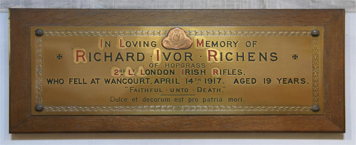In Loving Memory of / Richard Ivor Richens / of Hopgrass / 2nd Lt London Irish Rifles / who fell at Wancourt, April 14th 1917. Aged 19 years. / “Faithfull unto death.” / Dulce et decorum est pro patria mori.