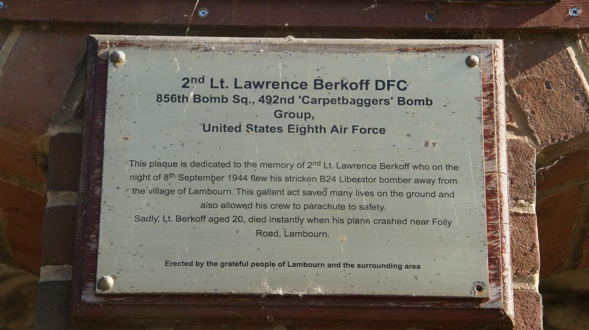 2nd Lt Lawrence Berkoff DFC / 856th Bomb Sq, 492nd ‘Carpetbaggers’ Bomb / Group, / United States Airforce / This plaque is dedicated to the memory of 2nd Lt Lawrence Barkoff who on the / night of 8th September 1944 flew his stricken B24 Liberator bomber away from / the village of Lambourn. This gallant act saved many lies on the ground and / also allowed his crew to parachute to safety. / Sadly, Lt Berkoff aged 20, died instantly when his plane crashed near Folly / Road, Lambourn. / Erected by the grateful people of Lambourn and the surrounding area