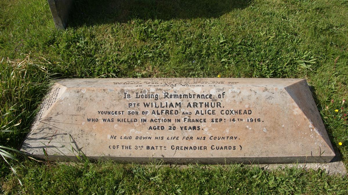 In Loving Remembrance of / Pte William Arthur / youngest son of Alfred and Alice Coxhead / who was killed in action in France Sep 14th 1916 / Aged 20 years / He laid down his life for his Country / (of the 3rd Battn Grenadier Guards)