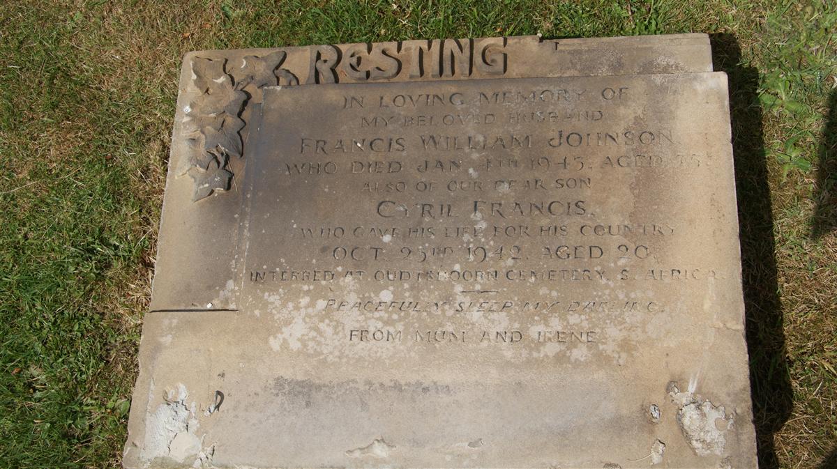 In loving memory of / my beloved husband / Francis William Johnson / who died Jan 4th 1945, aged 75 / also of our dear son / Cyril Francis / who gave his life for his country / Oct 25th 1942, aged 20 / interred at Oudshoorn Cemetery, S Africa / Peacefully sleep my darling / From Mum and Irene