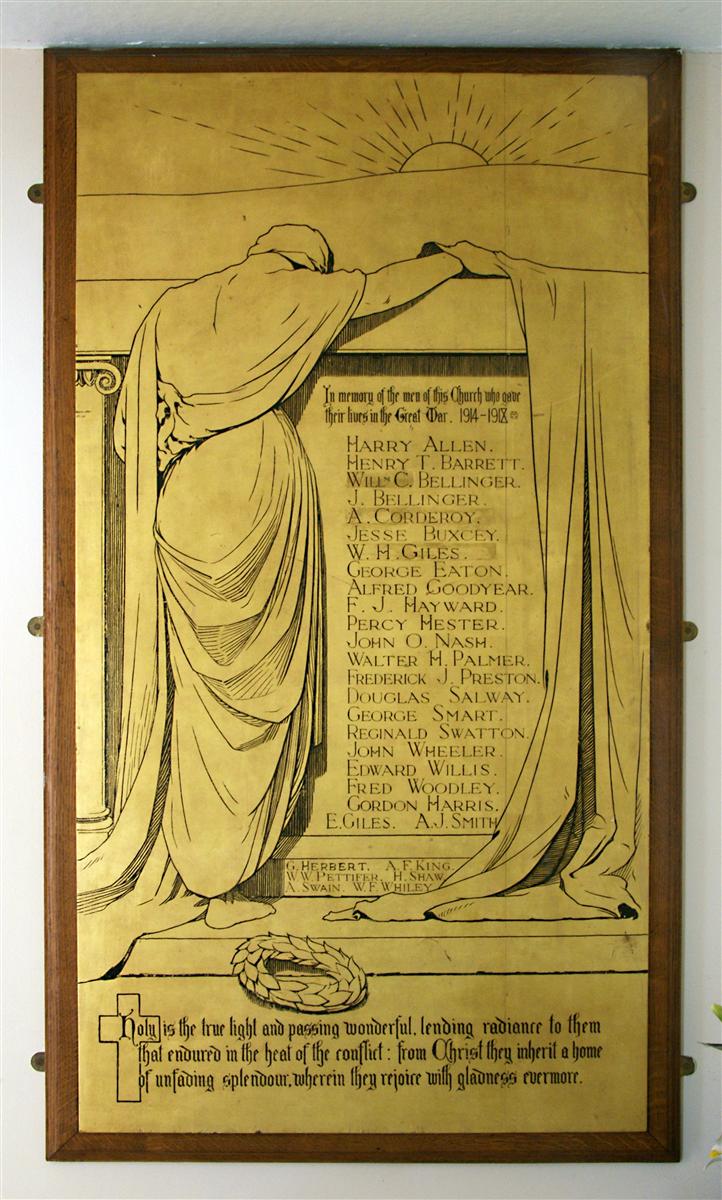 The memorial is a most artistic conception, the work of Mr W Henry Gore, a member of the congregation. The tablet, which is affixed to the south wall of the church, is of solid mahogany, gilded with English gold. Drawn in firm outline is a female figure, whose pose is taken from Watts' great picture, "Love and Death." Her head is bowed, and her outstretched hand draws on one side the draperies, revealing the names of the fallen; beyond the bowed and noble figure are seen the rays of the rising sun. Strength and simplicity characterise the design, and it is certainly one of the most beautiful and arresting of the war memorials in the district. Above the names is the following inscription: "In memory of the men of this Church who gave their lives in the great war, 1914-1918." The come the following names: