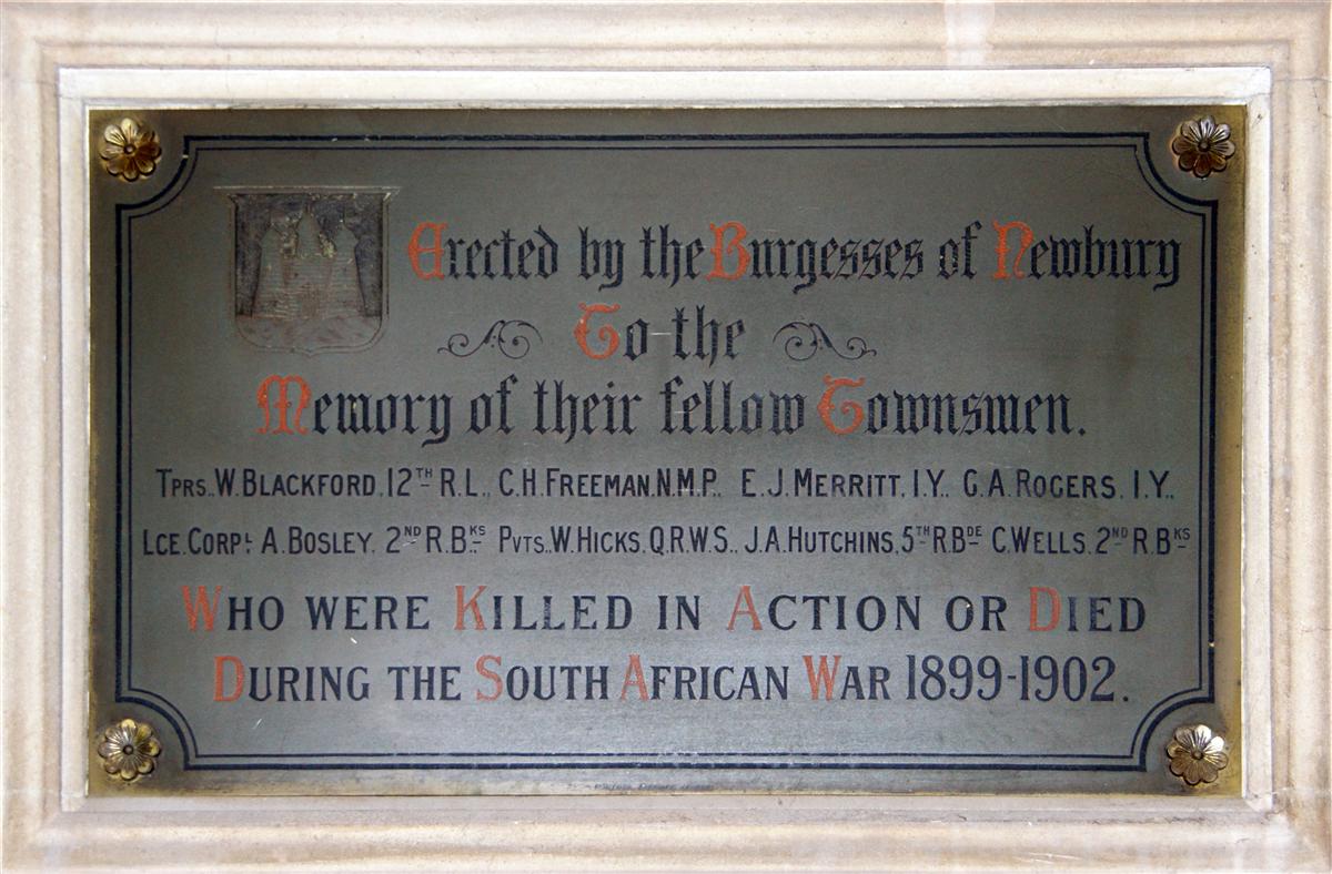 “Erected by the Burgesses of Newbury to the memory of their fellow townsmen – Troopers W Blackford (12th Royal Lancers), C H Freeman (Natal Mounted Police), E J Merritt (Berks Imperial Yeomanry), G A Rogers (Berks I Y 39th Coy), Lce-Corpl A Bosley (2nd Royal Berks), Pvtes W Hicks (Queen’s Royal West Surrey), J A Hutchins (5th Rifle Brigade), and C Wells (2nd Royal Berks), who were killed in action or died during the South African War, 1899-1902.”