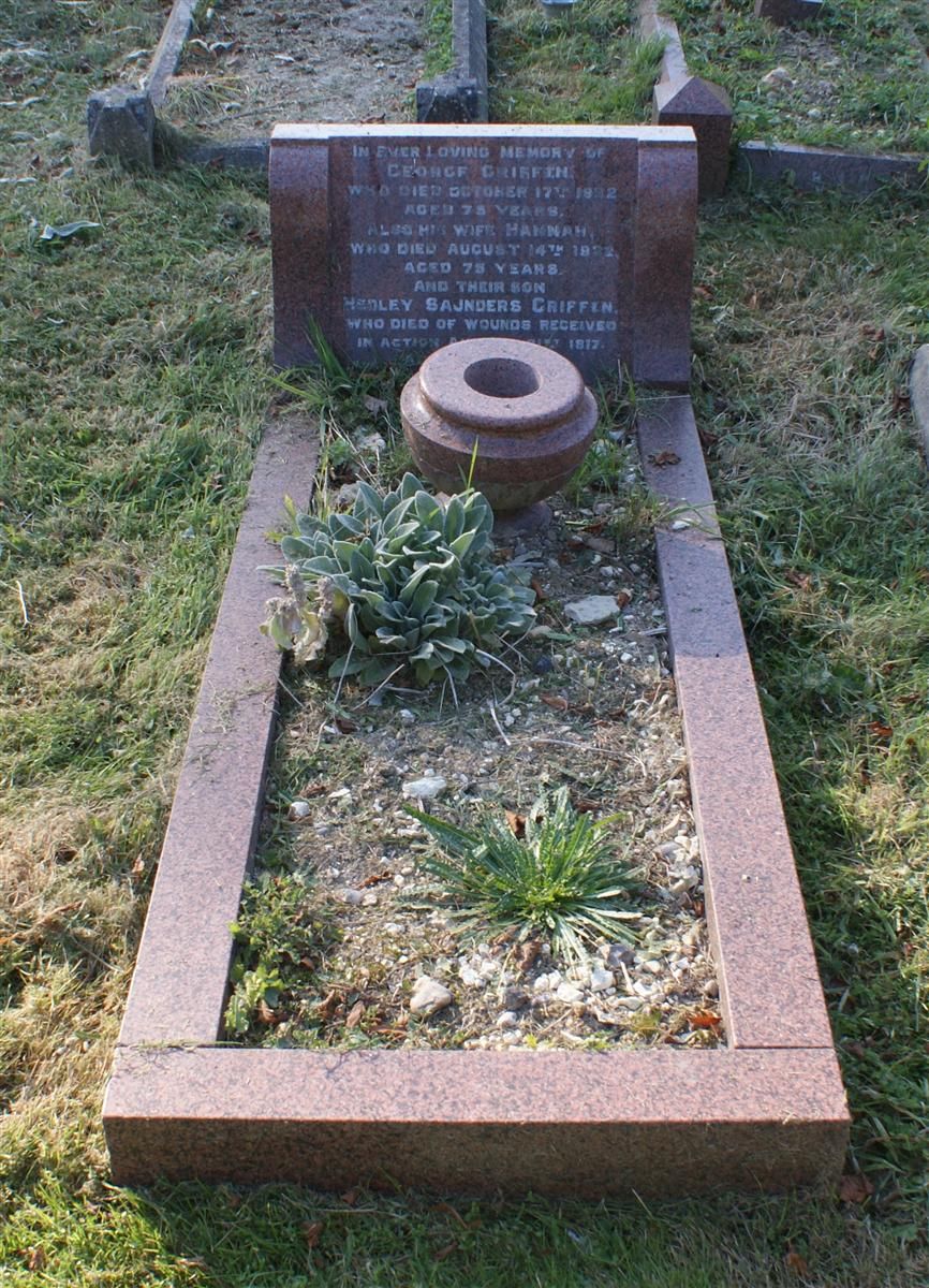 In ever loving memory of / George Griffin. / Who died October 17th 1932 / Aged 75 years. / Also his wife Hannah, / who died August 14th 1932, aged 75 years. / And their son, Hedley Saunders Griffin, / who died of wounds received / in action August 31st 1917. / Aged 20 years. / Death on earth / but birthday in heaven.