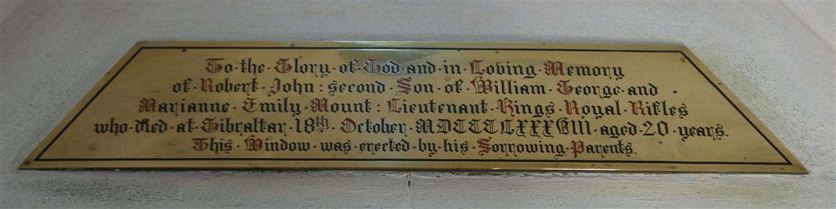 To the Glory of God and in Loving Memory / of Robert John, second Son of William George and / Marianne Emily Mount, Lieutenant Kings Royal Rifles / who died at Gibraltar 18th October MDCCCLXXXVIII aged 20 years. / This window was erected by his Sorrowing Parents.
