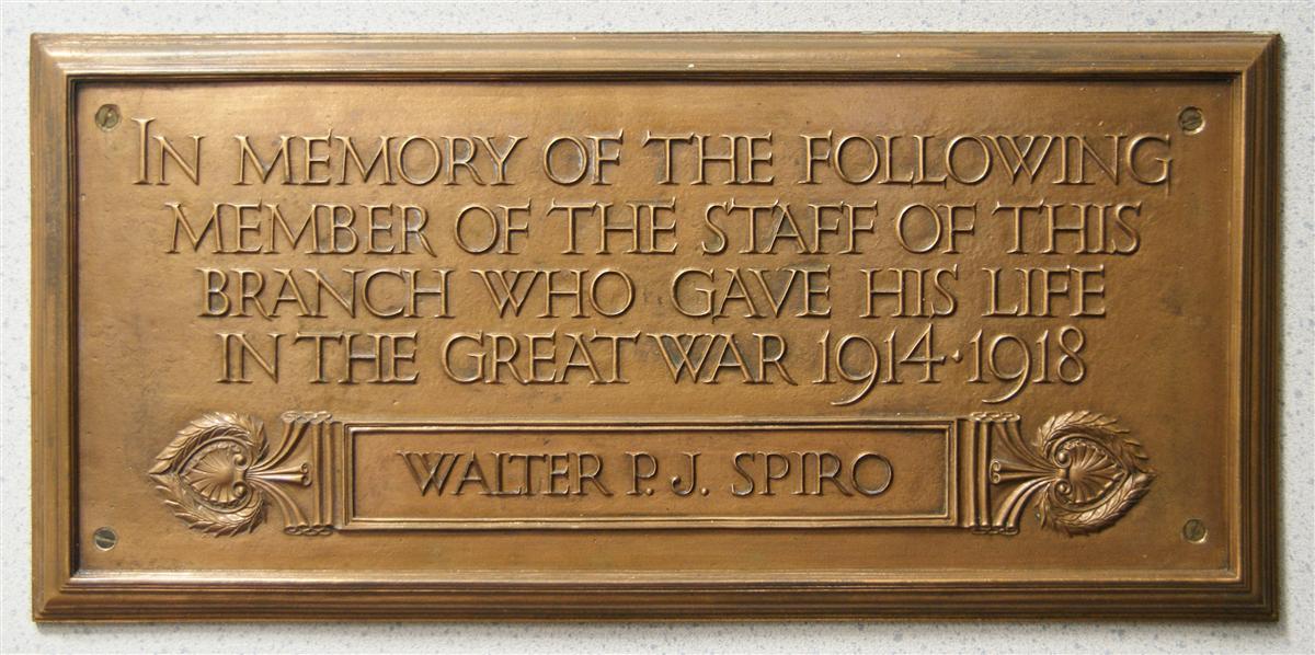 In memory of the following / member of the staff of this / branch who gave his life / in the Great War 1914-1918 / Walter P J Spiro