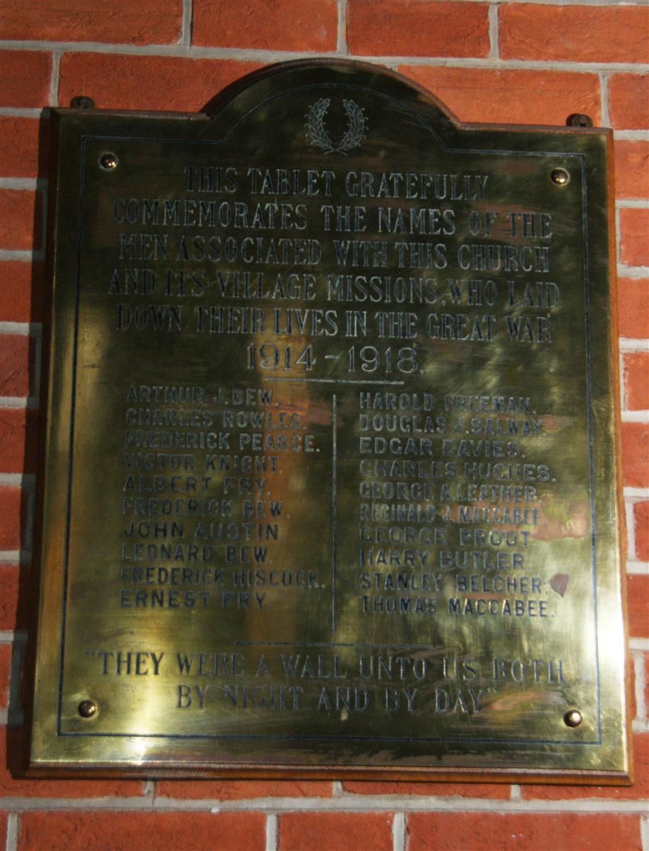 "This tablet gratefully commemorates the names of the men associated with this Church and its Village Missions, who laid down their lives in the Great War, 1914-1918."