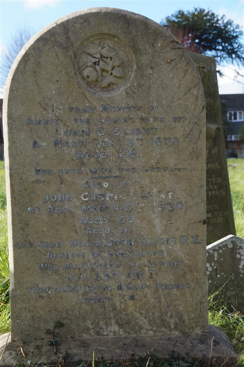 Also if Coy Sergt Major John Slight, RE, nephew of the above / who was killed in action / Jan 25th 1917 / and buried in Aveluy, France / aged 34.