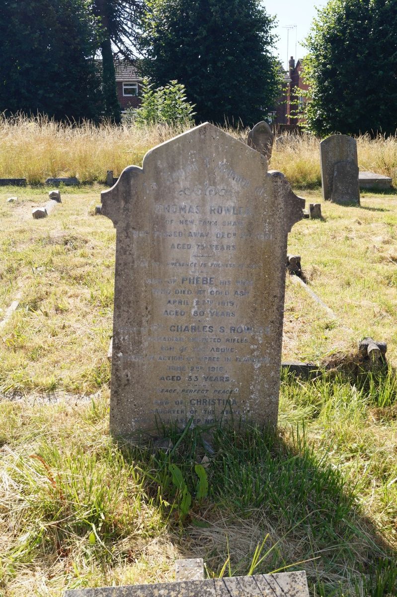 Also of Cpl Charles S Rowles Canadian Mounted Rifles son of the above killed in action at Ypres in Flanders June 2nd 1916 aged 33 years. "Peace perfect peace."