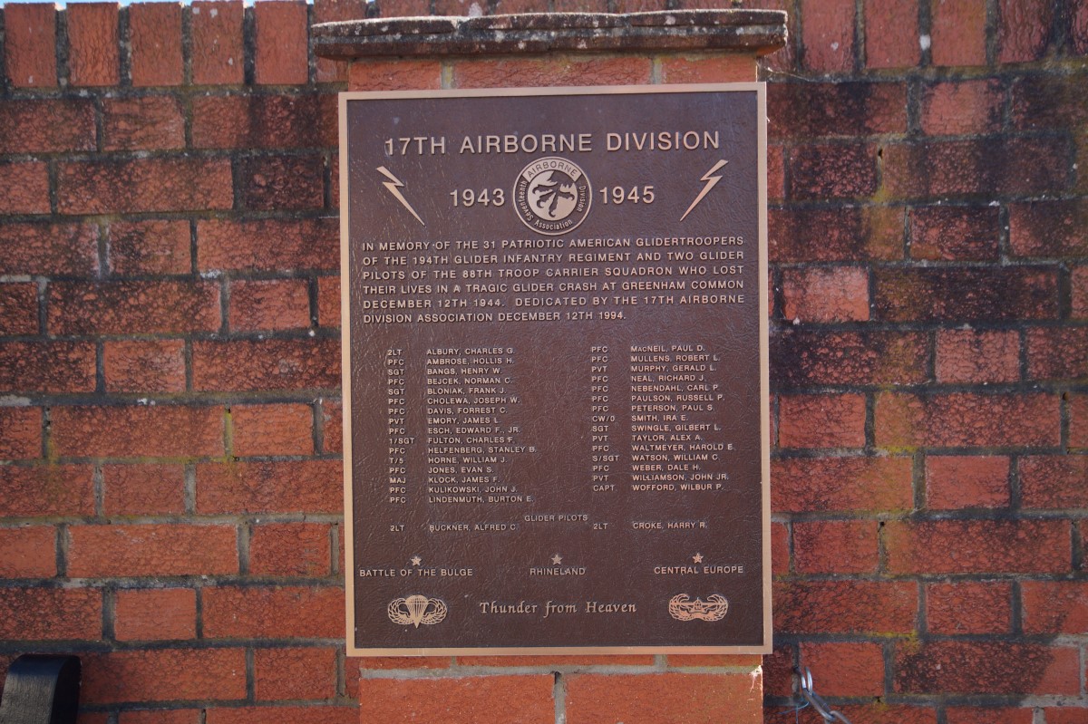 Im memory of the 31 patriotic American glidertroopers of the 194th Glider Infantry Regiment and two glider pilots of the 88th Troop Carrier Squadron who lost their lives in a tragic glider crash at Greenham Common December 12th 1944. Dedicated by the 17th Airborne Division Association Dcember 12th 1994.