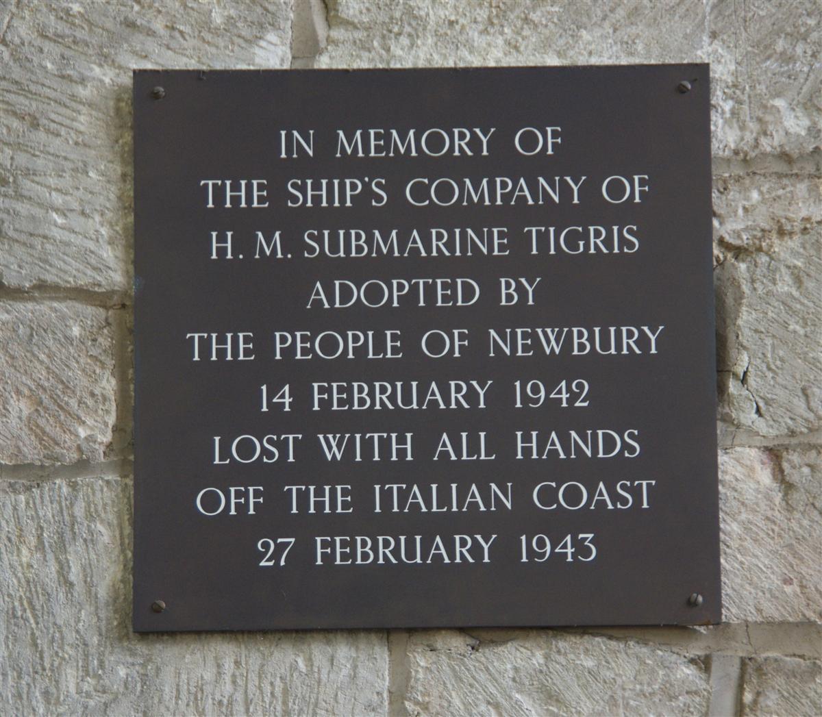 In memory of / the ship's company of / H M Submarine Tigris / adopted by / the people of Newbury / 14 February 1942 / lost with all hands / of the Italian coast / 27 February 1943