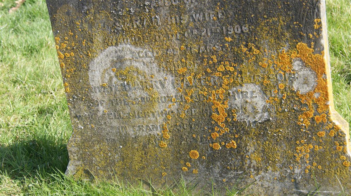![]() Harry Baker - inscription masked by lichen on his parent's gravestone at Brimpton (click to enlarge) |