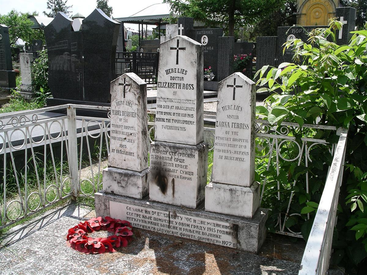 ![]() Lorna Ferris' grave (left) in Kragujevac, alongside those of Dr Elizabeth Ross and Mabel Dearmer |