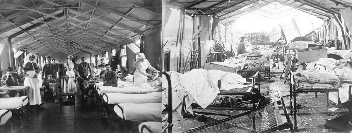 ![]() A general/stationary hospital ward in normal operation (left) and the effect of the St Omer bombing, probably on 58 General Hospital (right). |