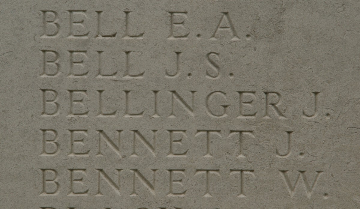 After the war a number of memorials were erected near the battlefields to commemorate the names of those men whose bodies were never found or identified. John Bellinger's name is recorded on Panel 93 of the Loos Memorial at the Dud Corner Cemetery just outside the town.