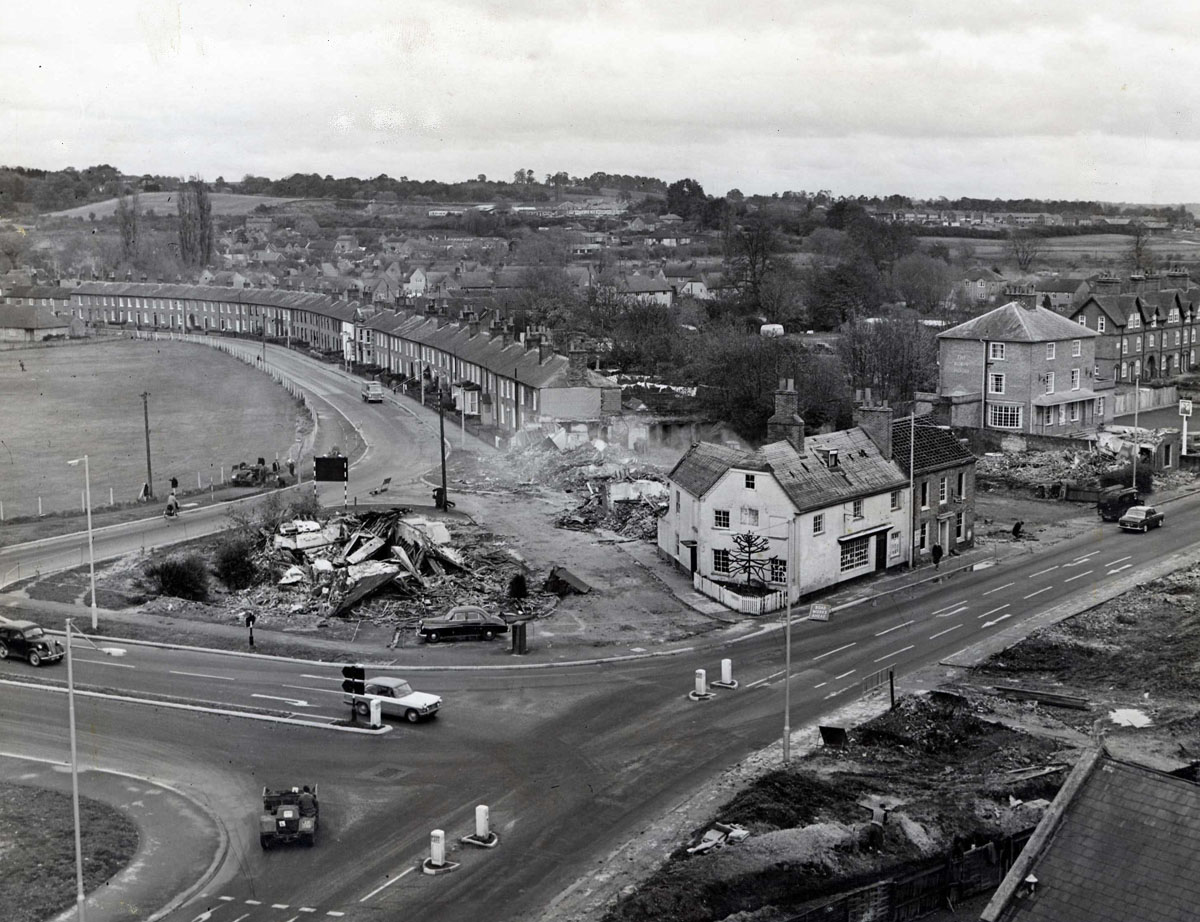 ![]() The Rushent family home at 1 Shaw Road is part of the rubble below a dust cloud in this photo of its demolition to make way for the Robin Hood roundabout. |