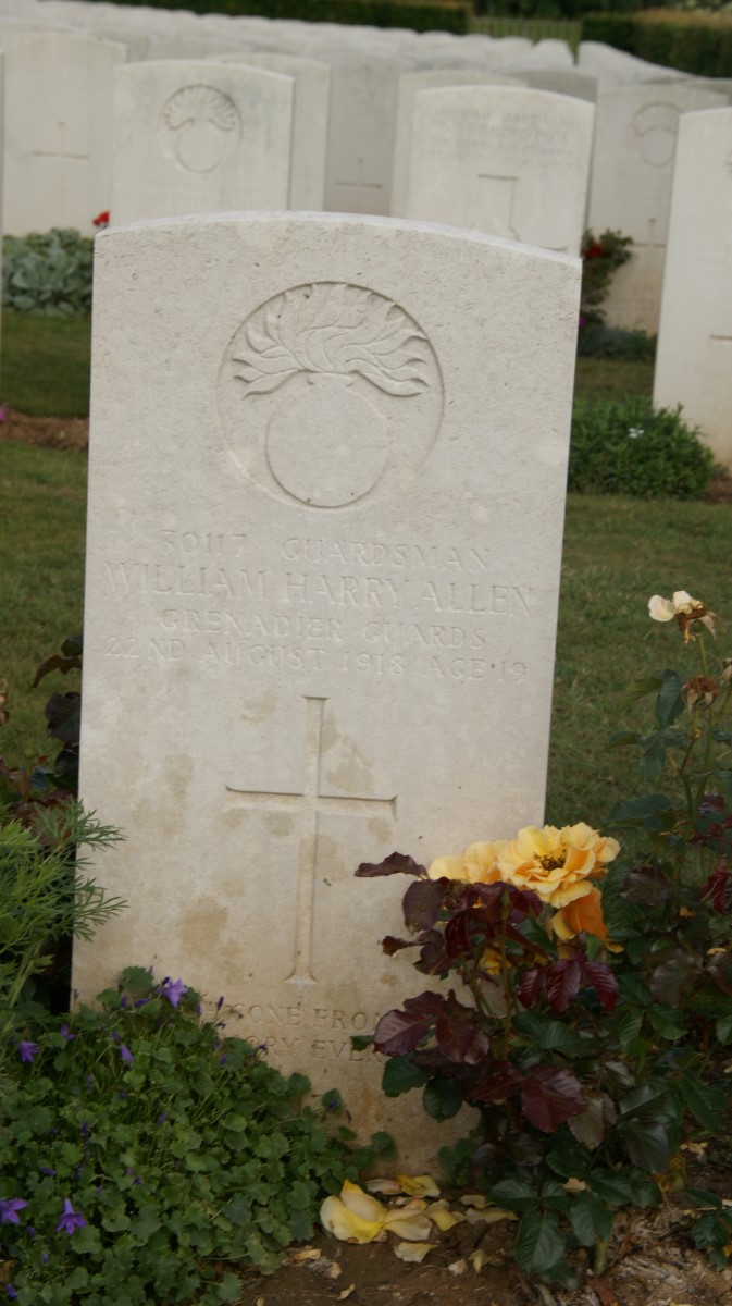His body was buried at Hamelincourt British Cemetery; this was one of many small cemeteries closed after the war when the bodies of Harry and seven fellow grenadiers were moved to Bucquoy Road Cemetery, Ficheux where Harry now lies in grave IV.K.29.