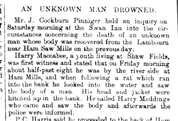 On 8 January 1904 the 16 year-old Harry was involved in some local excitement when he discovered a body in the River Lambourn near Ham Mills.  The body, which was believed to have been in the water for as long as a month, was never identified. The parapet on the bridge carrying the London Road over the Lambourn was noted to be too low after the path had been recently raised, making it more of a danger than a safety feature.