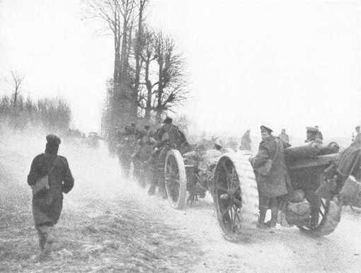 ![]() An RGA Heavy Battery on the move in France. The horse drawn gun is a 60 pounder. |