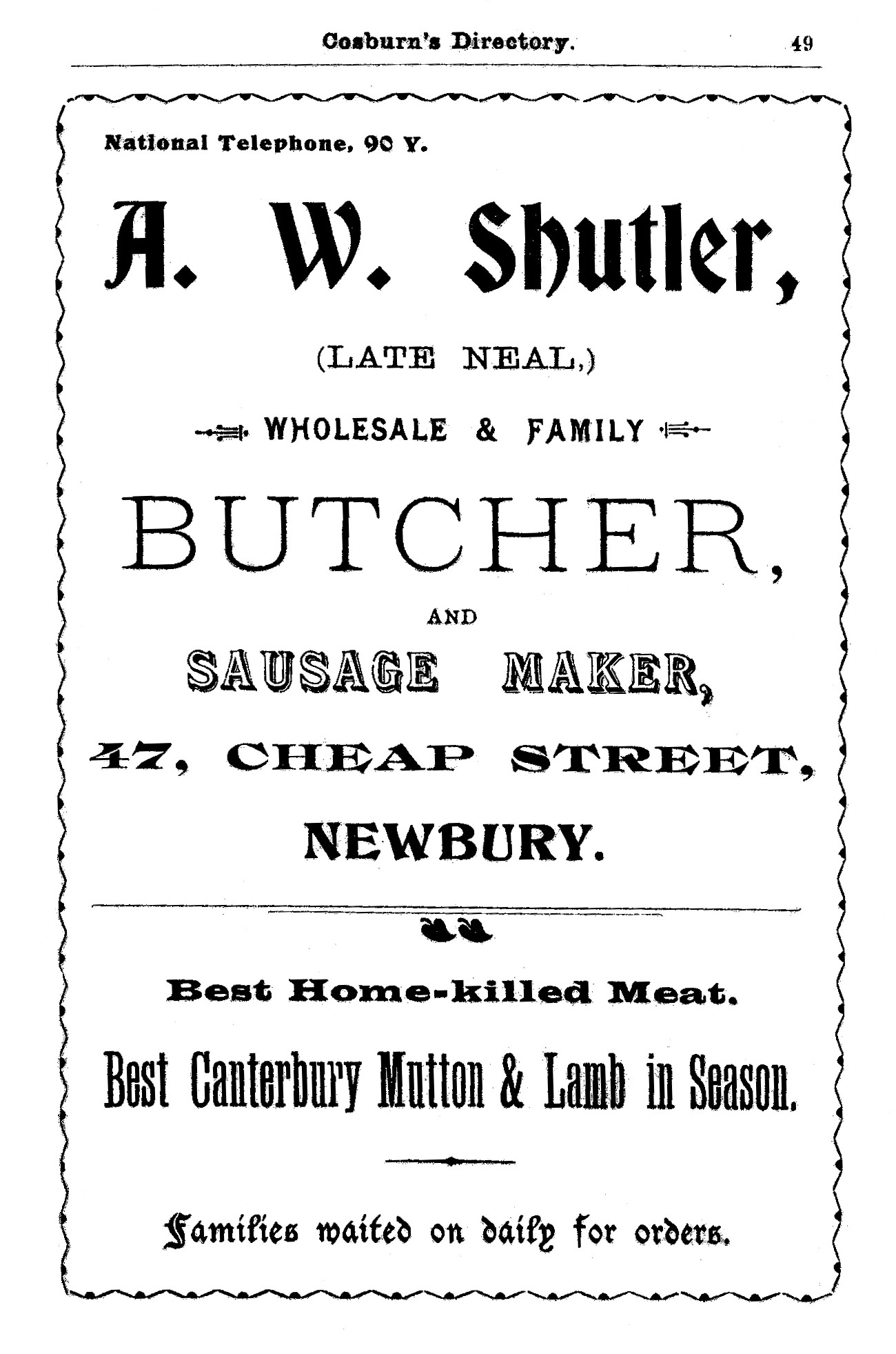 ![]() An advertisment for Amos Shutler's Cheap Street business - offering the best home-killed meat. |