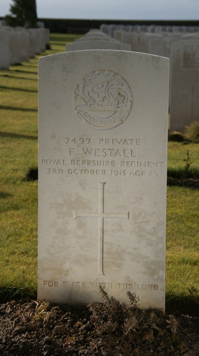 In ever loving memory of Private Frank Westall, of the Royal Berkshire Regt, reported missing after the Battle of Vermelles, September 28th, 1915, reported died a prisoner of war in February, 1916.