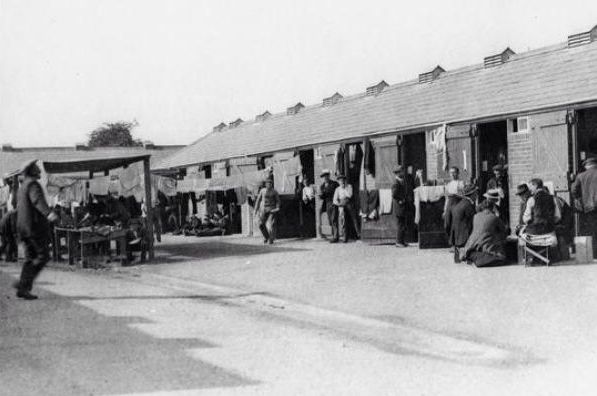 ![]() The stables at Newbury Racecourse in use as an internment camp in 1914. © IWM (Q 53359) |