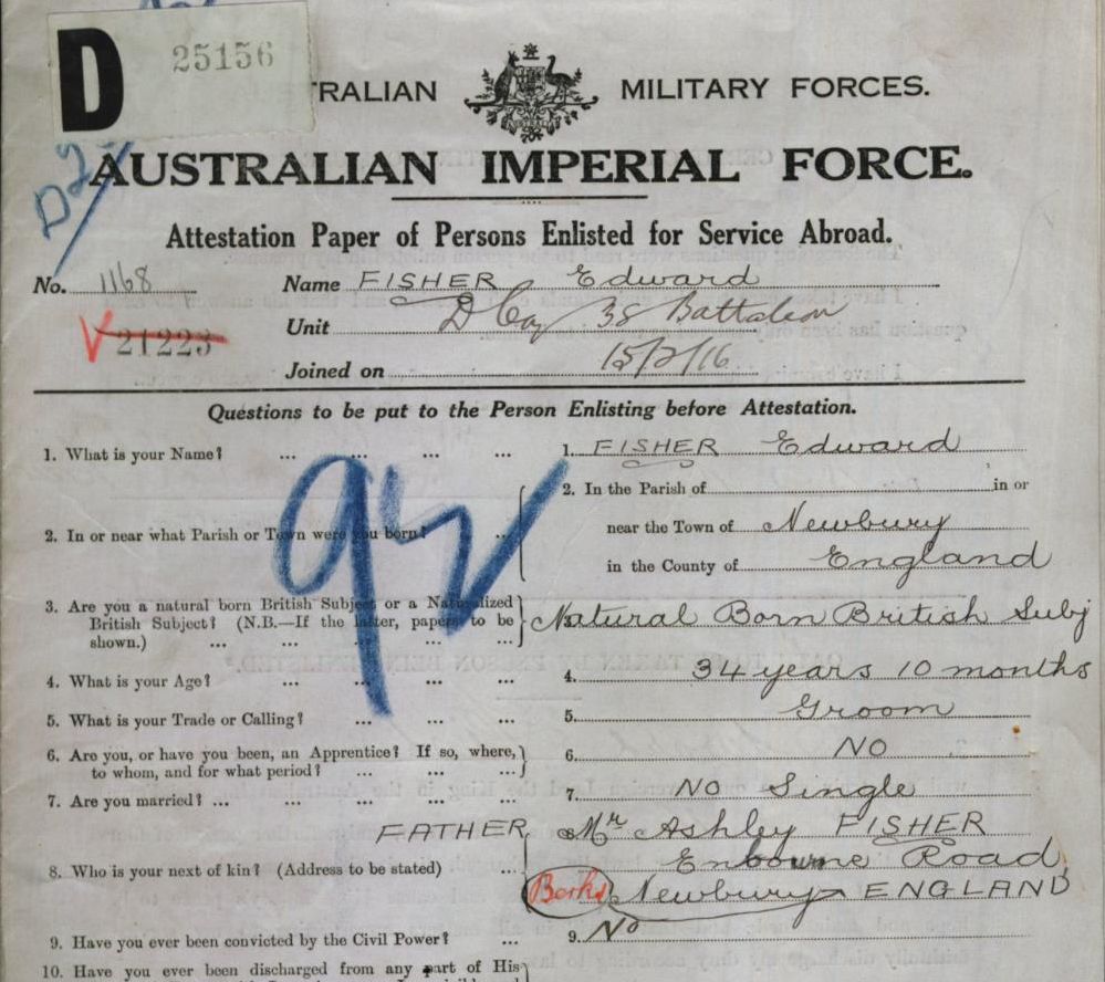 FISHER. – Killed in action in May, 1917, somewhere in France, Pte Ed Fisher, of the Australian Imperial Forces, aged 36, younger son of Mr A Fisher, of Enborne-road. – “Greater love hath no man that this that he lay down his life for his friends.” – With deep sympathy from his sincere friends.