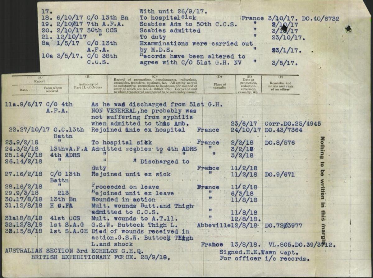 His military record is not covered in glory, being dominated by his medical record. He was posted to the 13th Battalion, AIF (Australian Infantry Force) and shipped over to France via Alexandria and Marseilles arriving at the latter on 8 June 1916. On Christmas Eve 1916 he was admitted into hospital with what must have been a severe case of scabies (infestation of the skin-burrowing scabies mite), resulting in three weeks treatment at the 39th Casualty Clearing Station (CCS) at Allonville. He rejoined the 13th Battalion of 13 January, only to return to hospital two weeks later. This time he was diagnosed with adenitis (inflammation of a gland or lymph node) – he was probably relieved to hear that this was diagnosed as ‘non-venereal’. On 10 March he returned to his battalion until October when he returned to hospital for three weeks, to be treated for scabies again. In February 1918 he once again has a spell in hospital with scabies. On discharge he was given three weeks leave returning to duty on 9 March 1918.