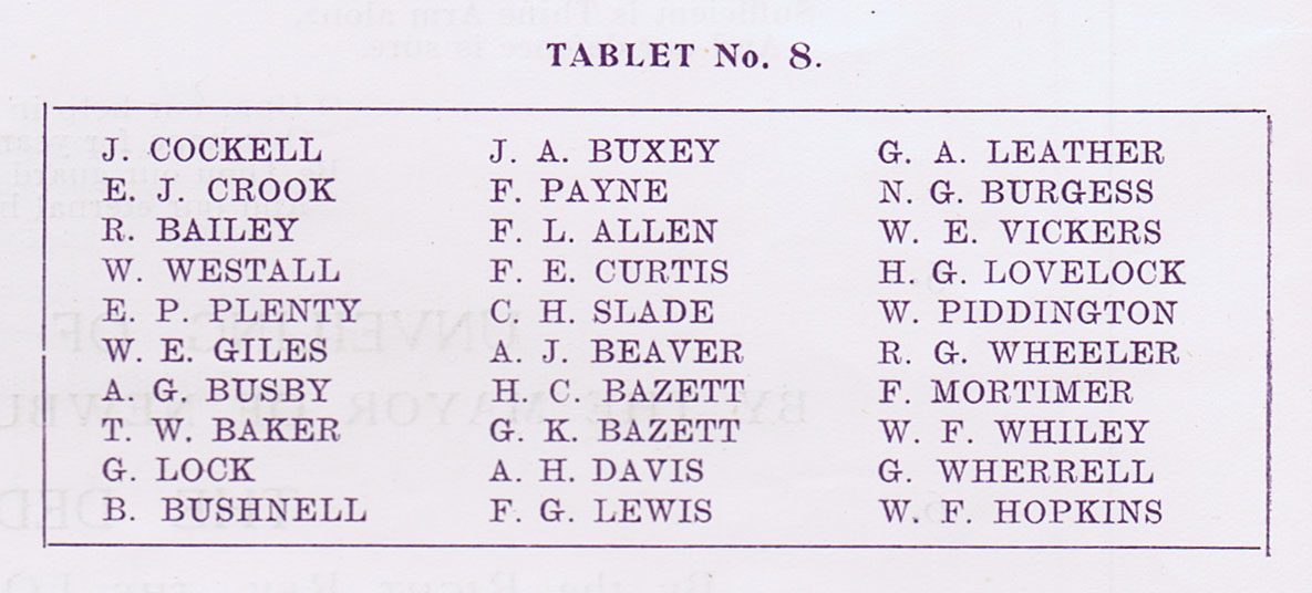 The first name on panel 9 of the Newbury war memorial is that of H Cockell. However, this is an error almost certainly one of a number of such errors introduced when the original stone tablets were replaced by the current bronze tablets in 1950. A second, contemporary, list of the names on each panel has survived on the programme for the memorial's dedication and unveiling ceremonty on 1 October 1922. The listing for what was designated Tablet 8 on the programme (actually the 9th tablet facing the memorial reading left to right) gives the first entry as J Cockell, readily identified as Jesse Cockell from Adey's Buildings, Stroud Green.