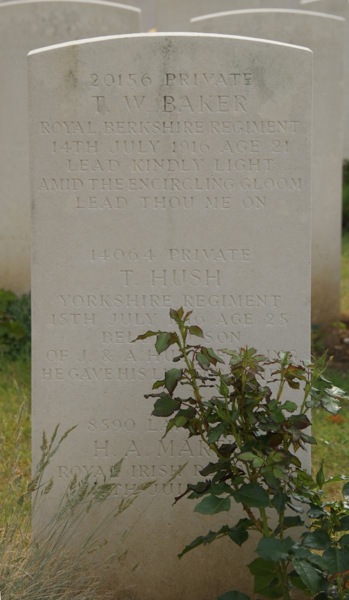 On 1 July the Allies launched a massive assault on the Somme. For the first few days the 8th Royal Berks were in reserve, but on 10 July they moved forward to man two trenches near Lozenge Wood (between Fricourt and Contalmaison); the following day they moved forward to Contalmaison, which had been taken the night before by the 8th Yorks. Over the next few days they advanced a small distance over territory largely evacuated by the Germans meeting only light resistance, until 14 July when they attacked the new German line meeting far more serious resistance. Although they succeeded in entering the German trench, they were beaten back by a determined German counter attack. Casualties over these few days were considerable; 6 officers and 143 men being killed, missing or wounded; 2 of these are recorded in the war diary as dying of their wounds. Perhaps one of these was Thomas Baker who is reported to have died of wounds on 14 July 1916. However, it is more likely that he was among the 123 men listed as wounded for he died well behind the lines at one of the Casualty Clearing Stations operating at Heilly Station between Albert and Amiens.