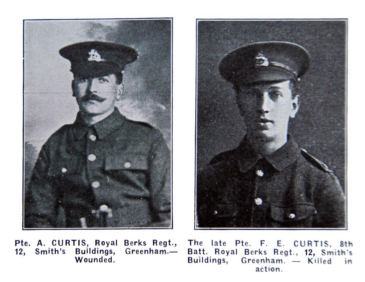 Pte F E Curtis, of the 8th Royal Berks, reported missing since September 25th, is the youngest son of Mrs Curtis, Smith’s Buildings, Stroud Green, who has also another son of the 5th Royal Berks still in hospital at Leicester, with shrapnel wounds in the right shoulder. Pte F E Curtis was one of ten in the employ of Mr Lloyd Baxendale, Greenham Lodge, previous to the outbreak of the war, who have since joined the colours. One of these has been killed and two wounded.