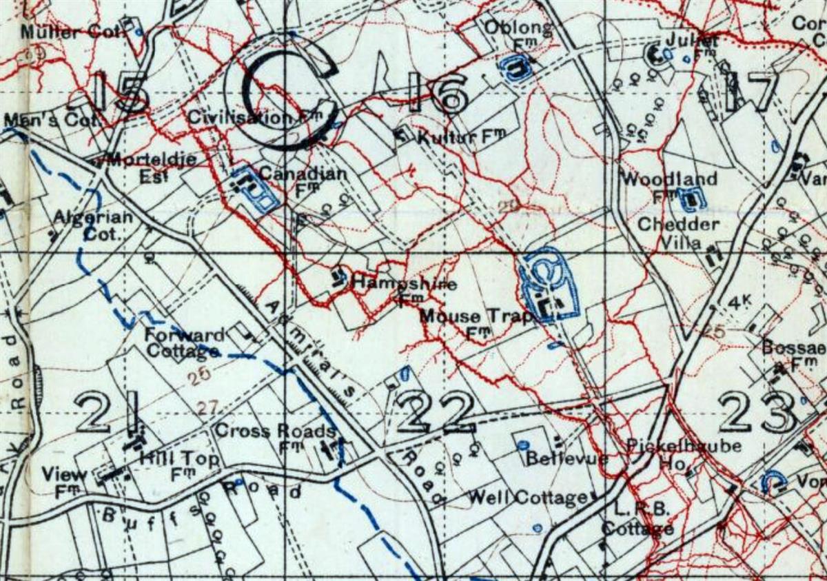 This was not their first resting place, after the war a number of battlefield cemetery were closed for one reason or another and the soldiers' remains were ‘concentrated’ into nearby cemeteries. These ‘concentration’ cemeteries also took a large number of bodies recovered from the battlefields. Reginald’s remains and those of a number of his comrades were recovered from map reference C.22.a.78 (see map); most of his comrades had no means of identification, but a fragment of a wooden cross was found in Reginald’s resting place, containing enough information to identify him. This location was pretty much on the German front line during 1916, not far from a strongpoint known as Hampshire Farm - it is amazing that anything remained to identify him.