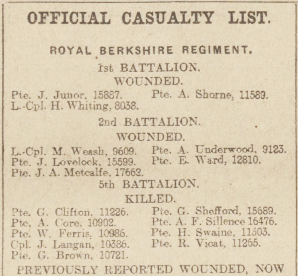 SHEFFORD – On Oct 18, 1915, in France, Pte George Shefford, 5th Royal Berkshires, son of Mrs Shefford, of Stroud Green, Newbury, aged 20. Killed in action.
