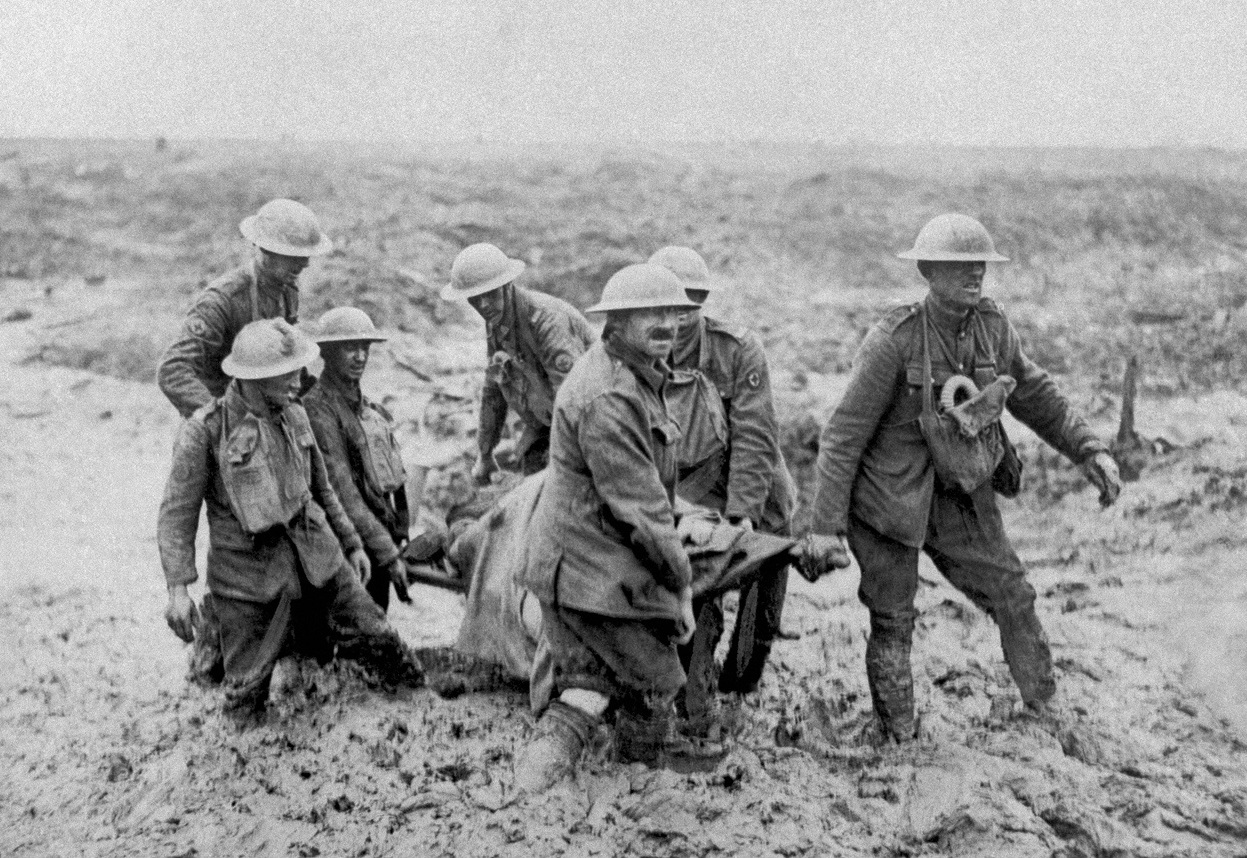 ![]() A stretcher party of seven men, struggling to get a single casualty to a treatment facility through the Passcehendaele mud. |