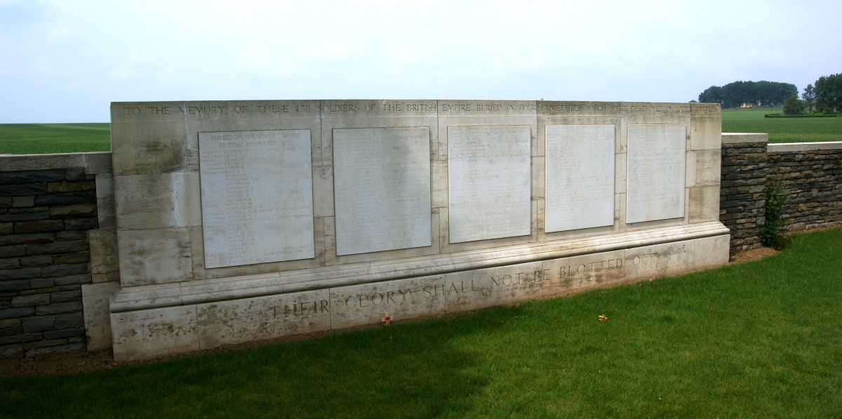 George was buried in Wancourt Road Cemetery No. 2 on the eastern outskirts of Neuville Vitasse. Later in the war this cemetery one of several in the area that were destroyed by shellfire. Those buried there are now commemorated on a special memorial in London Cemetery, Neuville-Vitasse. George’s name is on panel 1 of this memorial.