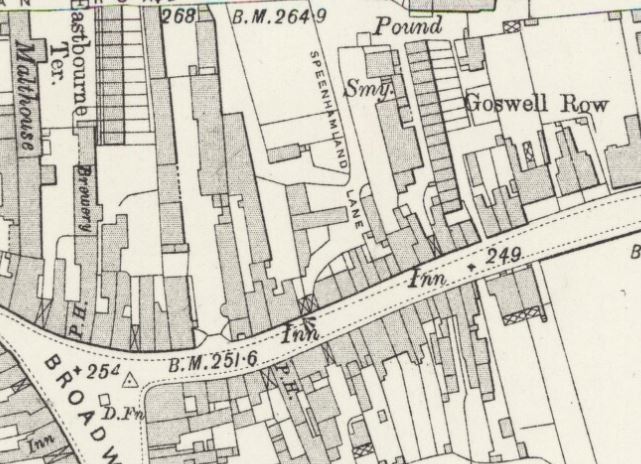 ![]() Map of part of Speenhamland, showing the position of Goswell Row (upper right). |